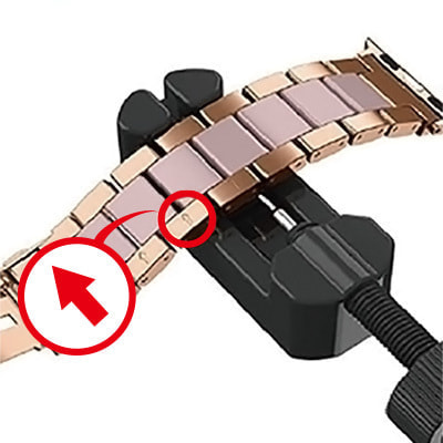 1、バンドを裏返し、バンドに印字している矢印の方向へ調整器具の先端をバンドのピン穴に差し込みます。調整器具のつまみを回転(時計回り)させ、バンドのピンを外します。