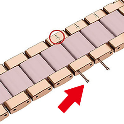 1、バンドを裏返し、バンドに印字している矢印の方向へ調整器具の先端をバンドのピン穴に差し込みます。調整器具のつまみを回転(時計回り)させ、バンドのピンを外します。